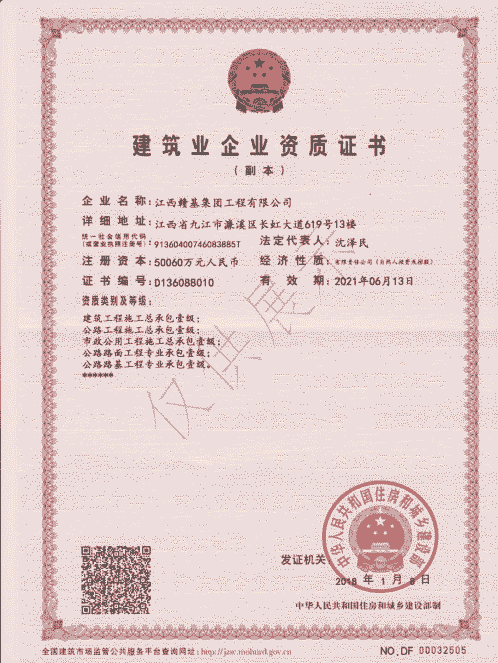江西贛基集團工程有限公司是國家壹級施工總承包企業(yè),具有公路工程、市政公用工程、房屋建筑工程總承包壹級資質(zhì);公路路基、路面專業(yè)壹級;水利水電工程、電力工程、城市園林綠化、公路養(yǎng)護工程貳級資質(zhì)。